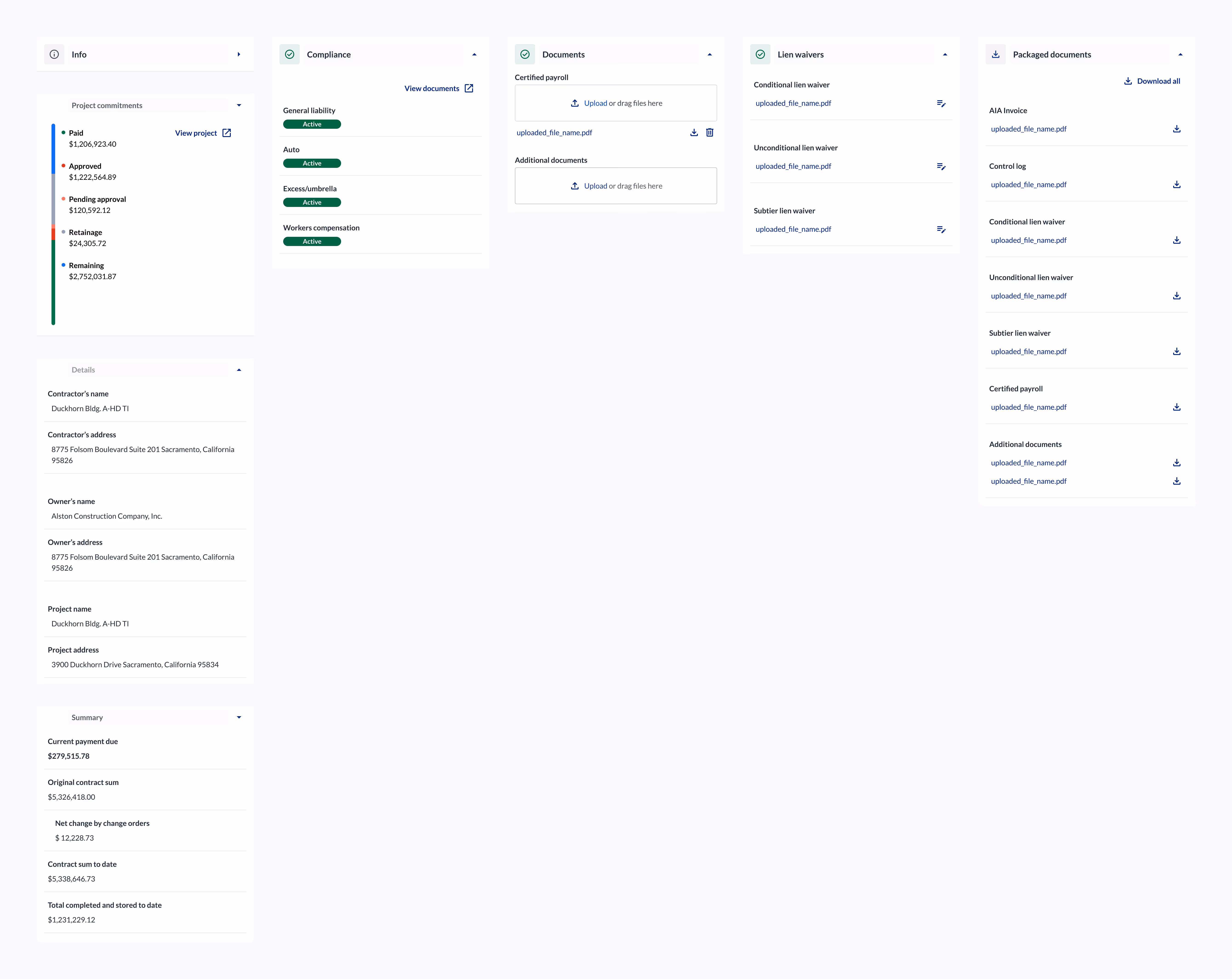 - Left Column (Primary Functionality): Houses the main workflows — such as SOV creation, invoice submission, or waiver signing.